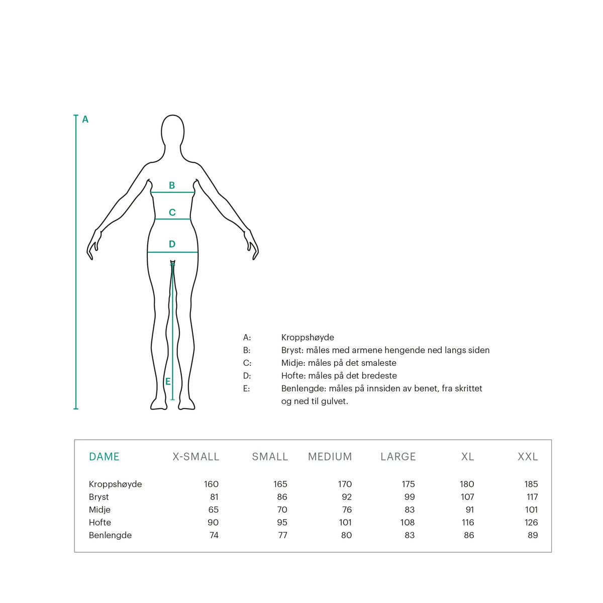 Størrelsesguiden gir en indikasjon på hvordan vi tar mål på våre plagg, og hvilken størrelse du bør bestille sett i sammenheng med målene på kroppen din. Målene bør tas direkte på kroppen. Hvis du liker en løsere passform kan du gjerne gå opp en størrelse, og motsatt om du ønsker en ettersittende passform.Våre mål er veldig generelle og bør derfor kun brukes som veiledning, da kropper kommer i alle størrelser og fasonger.Alle mål er oppgitt i centimeter.